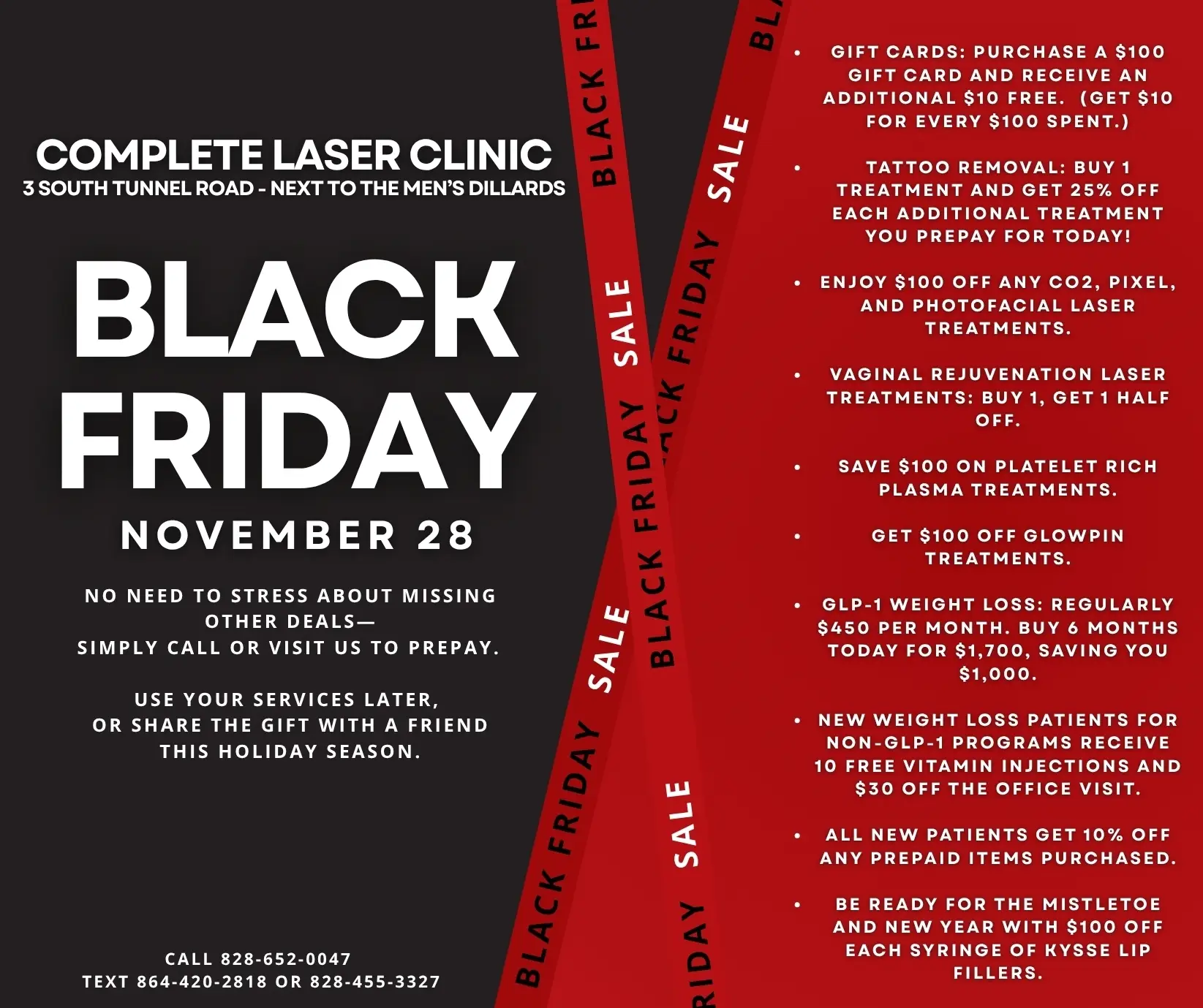 Get ready for incredible savings this Black Friday, November 28, at Complete Laser Clinic, located at 3 South Tunnel Road, next to the Men’s Dillard’s.