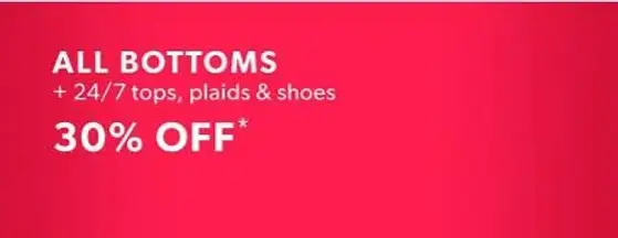 Act fast! Shop in store and get 30% off bottoms, 24/7 tops, plaids & shoes.
